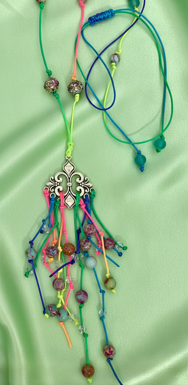 Colorful knotted necklace with fringe focal. Tons of Imperial Jasper, complimented with Lava Rocks and Crystals. Sliding knot closure, adjustable from 16"-24".