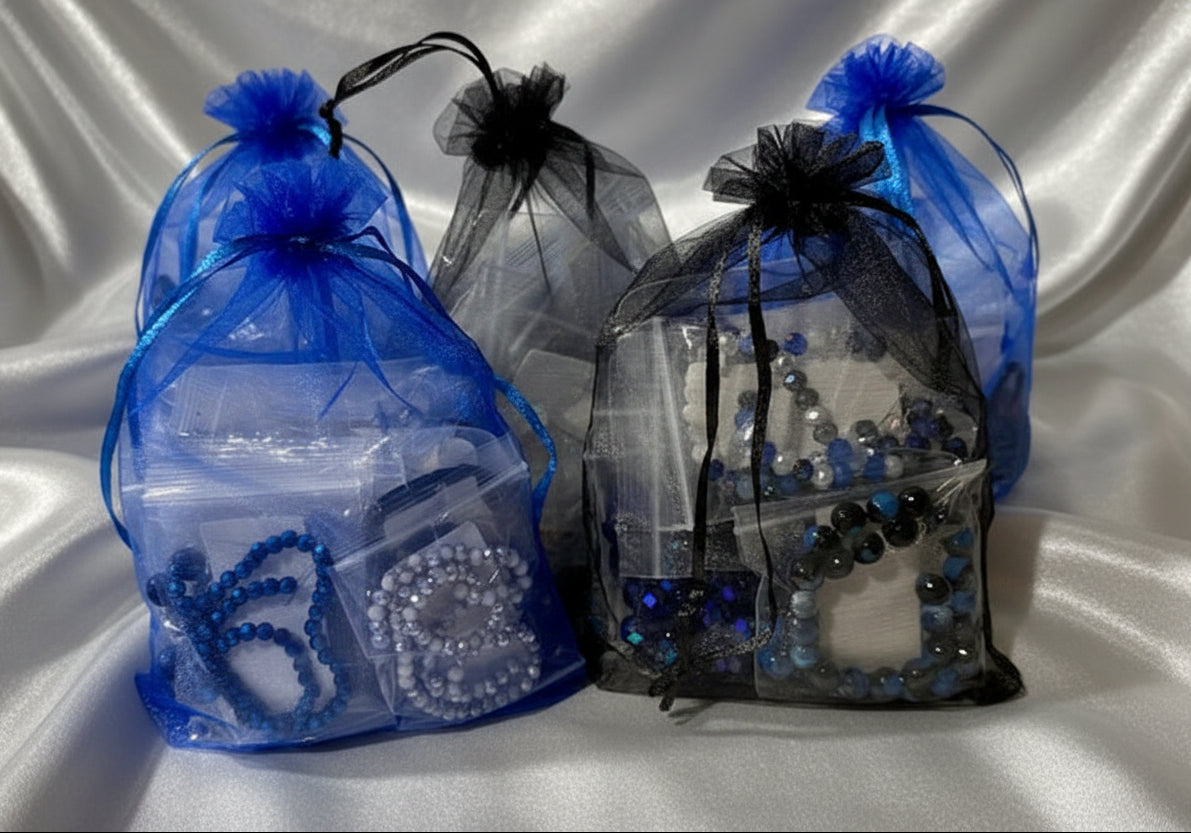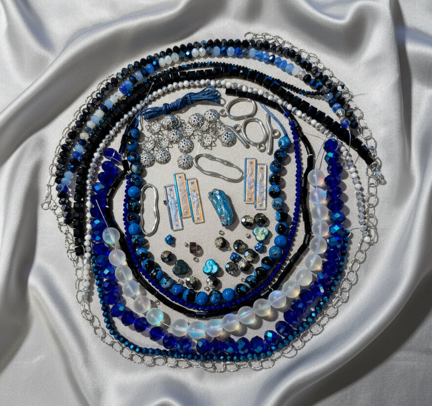 - Loose bead mix: 9mm Blue/Black matte Czech pressed trillium flowers, 6mm Metallic Blue Czech pressed bell flowers, 7.5-8mm Black AB/Clear flat faceted rondelles