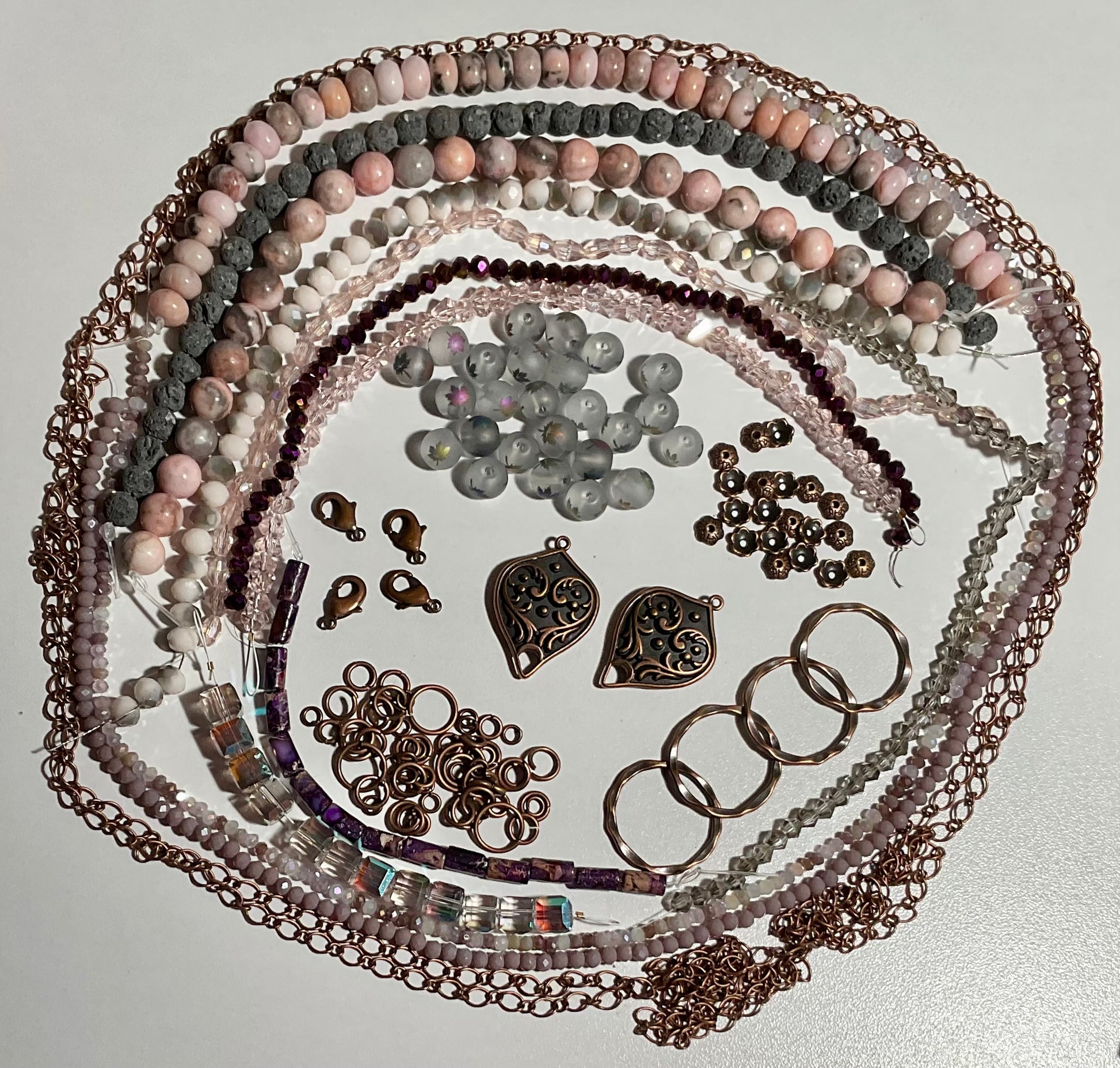 In this elegant, romantic collection you'll find pink reminiscent of universal love, luxurious purple, silver shining with joy, beautiful maple leaf beads, grounding grey lava rocks, plenty of sparkling crystals, and my favorite metal color, copper, with it's shimmer bringing a harmonious melody of warmth and sophistication!